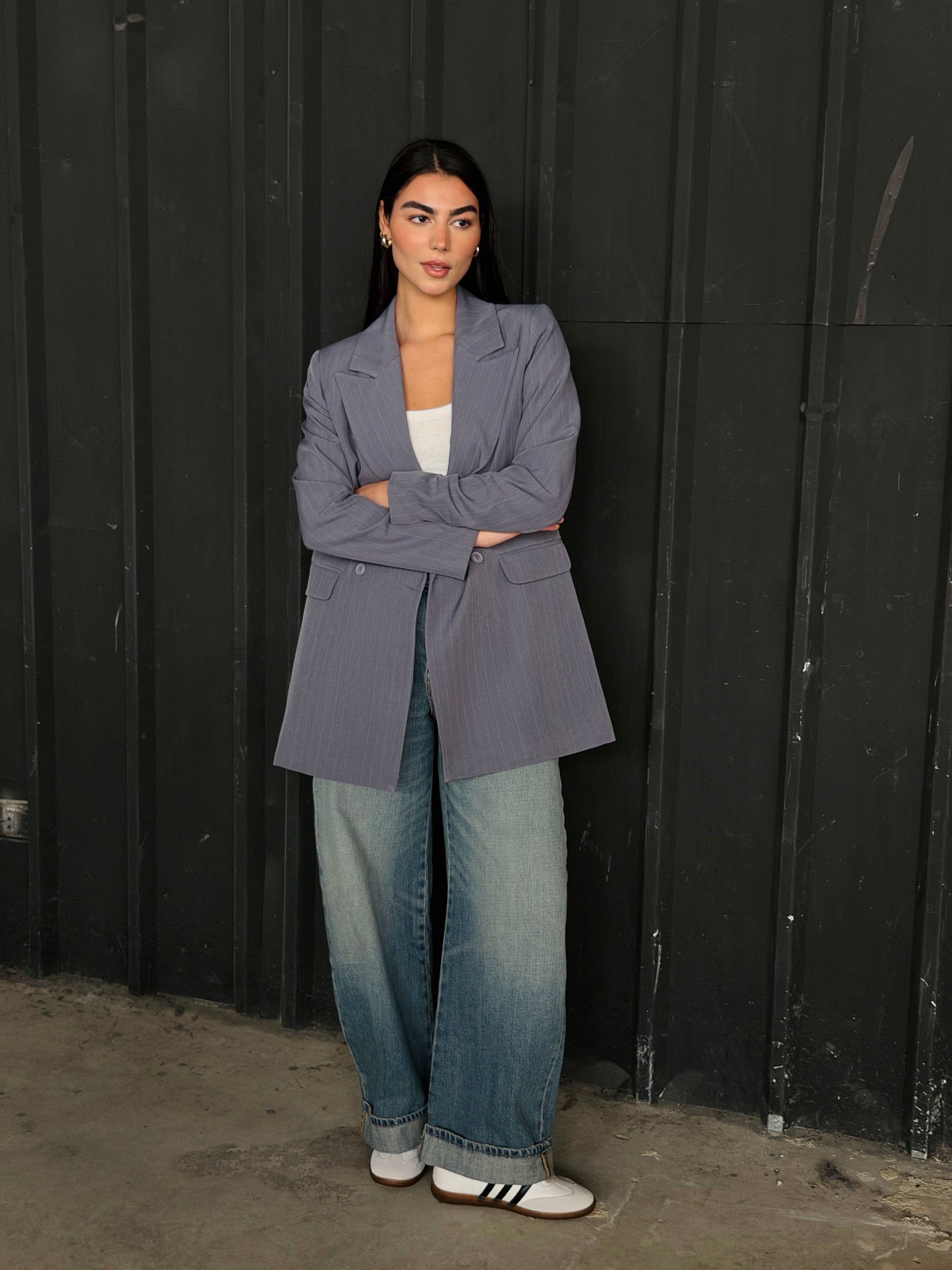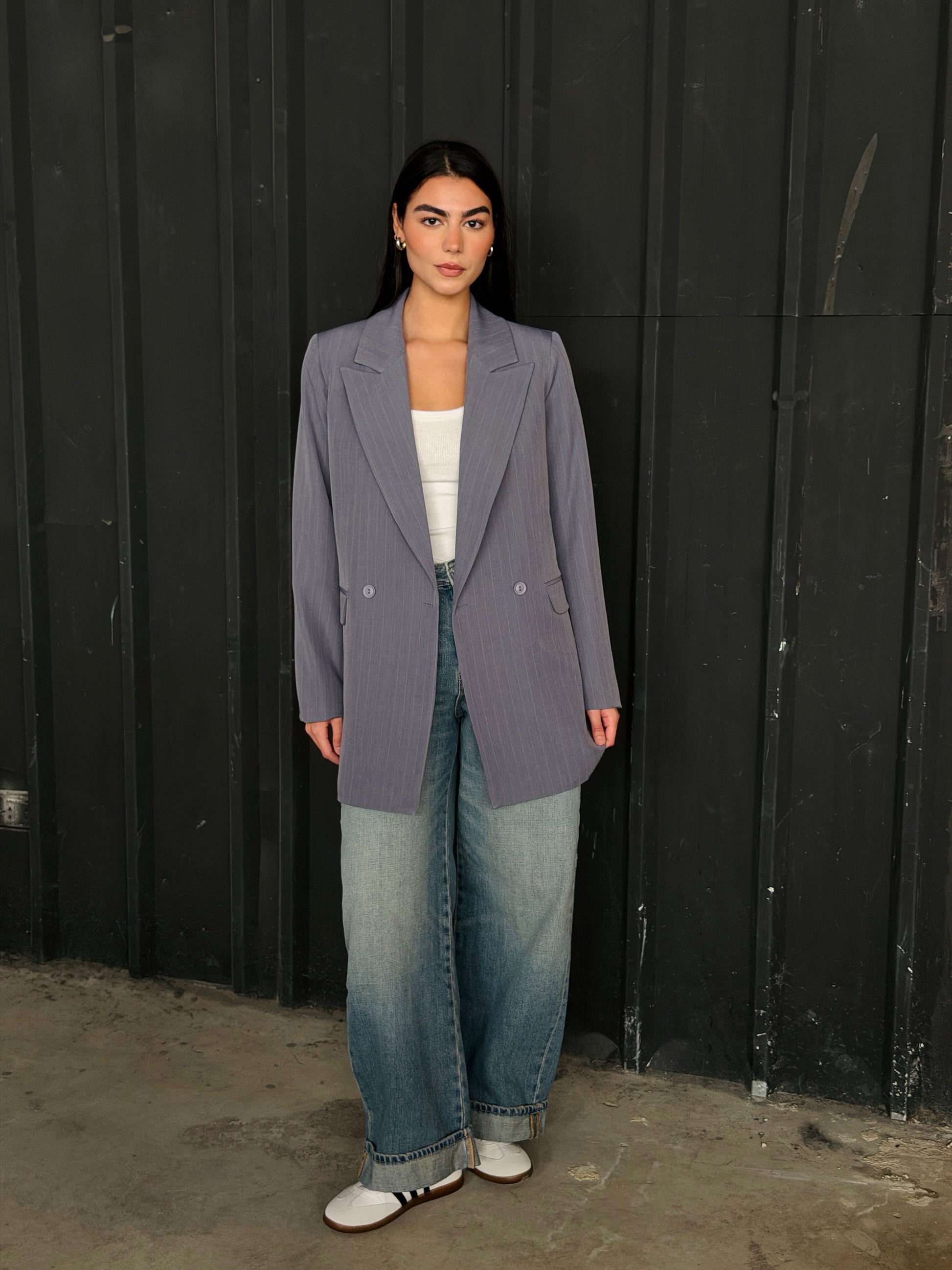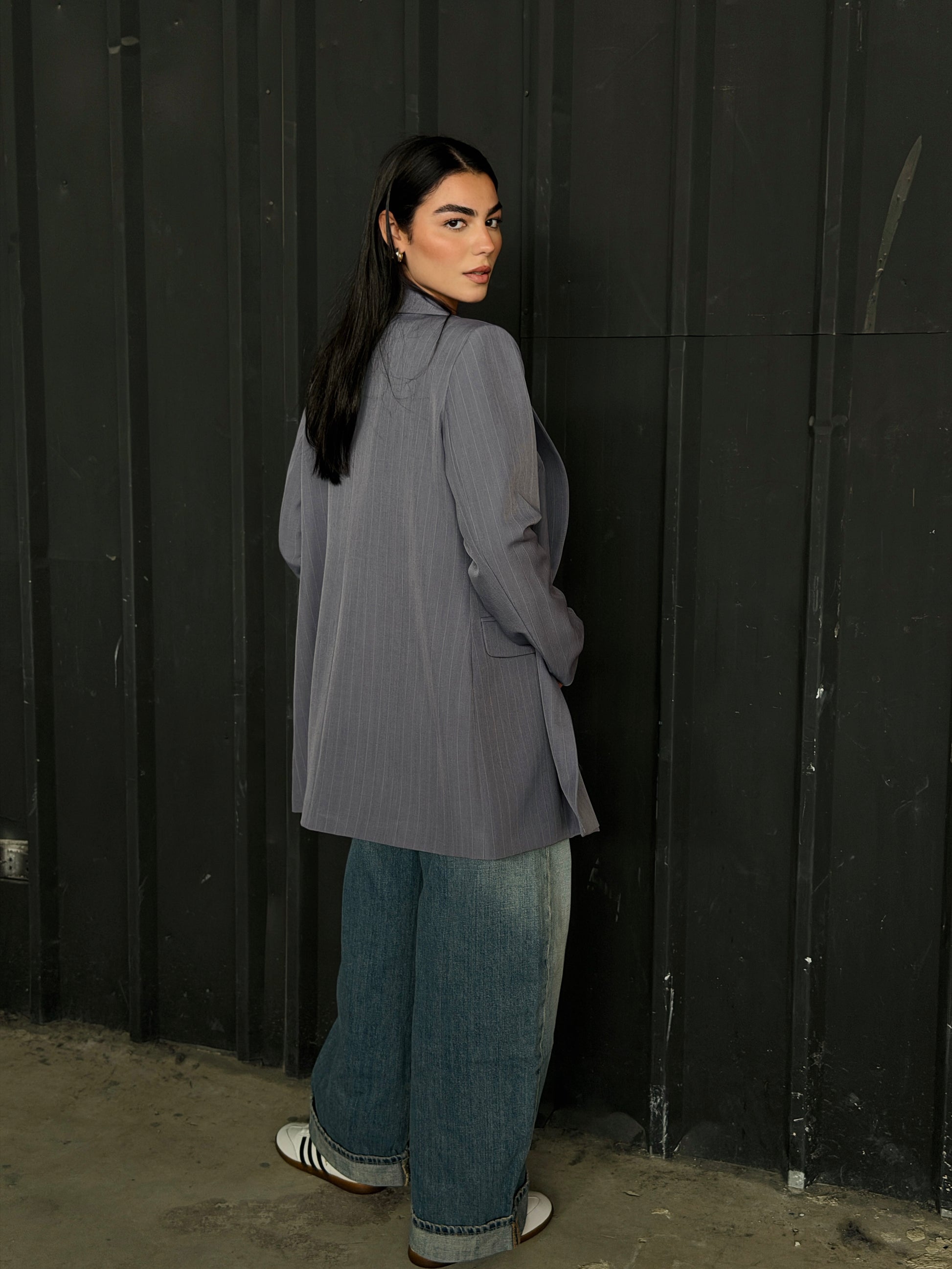 Elevate your style with this oversized striped blazer, perfect for making a statement. The subtle texture and satin lining add a touch of sophistication, while the relaxed fit ensures comfort and versatility.